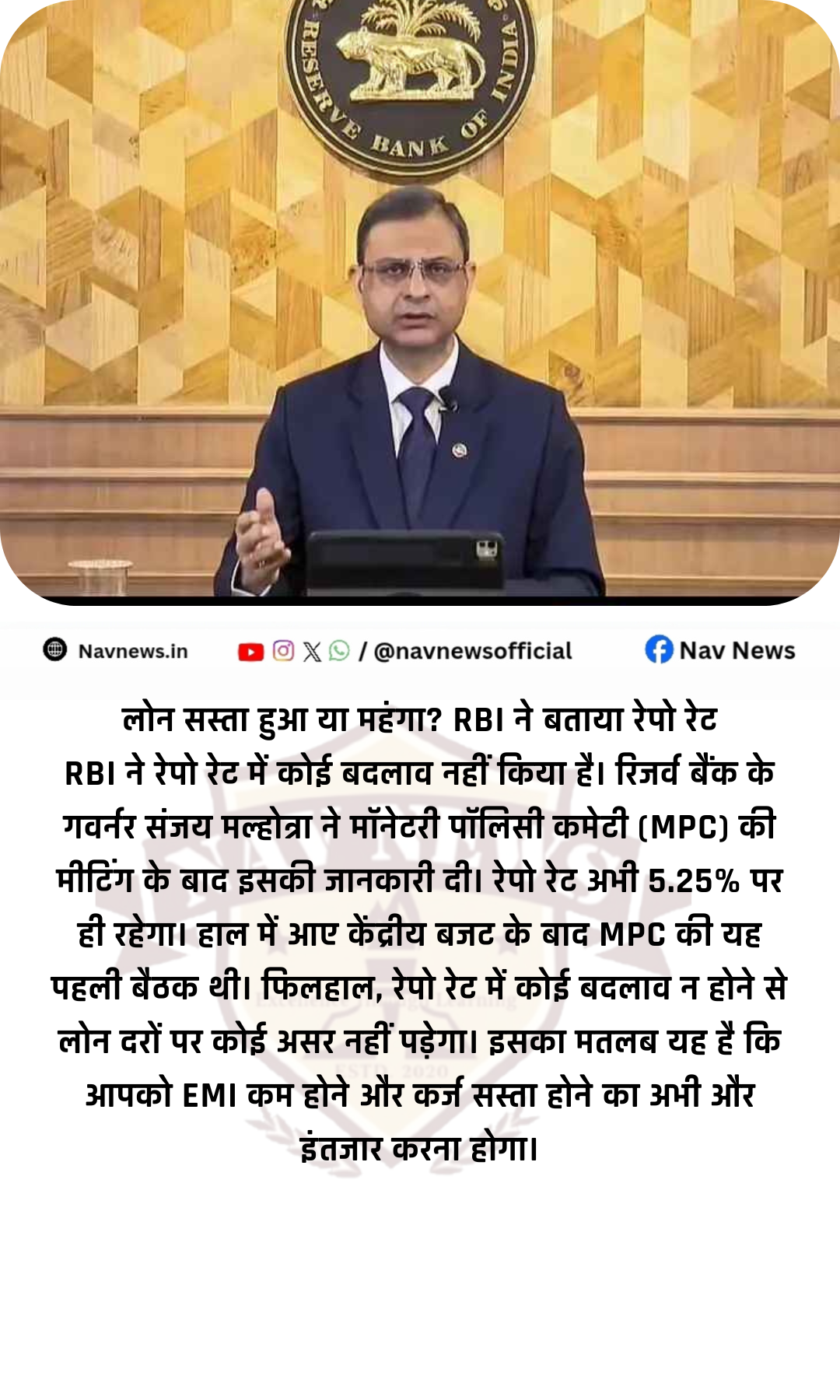 गवर्नर संजय मल्होत्रा ने घोषणा की है कि रेपो रेट को 5.25% पर स्थिर रखा गया है।