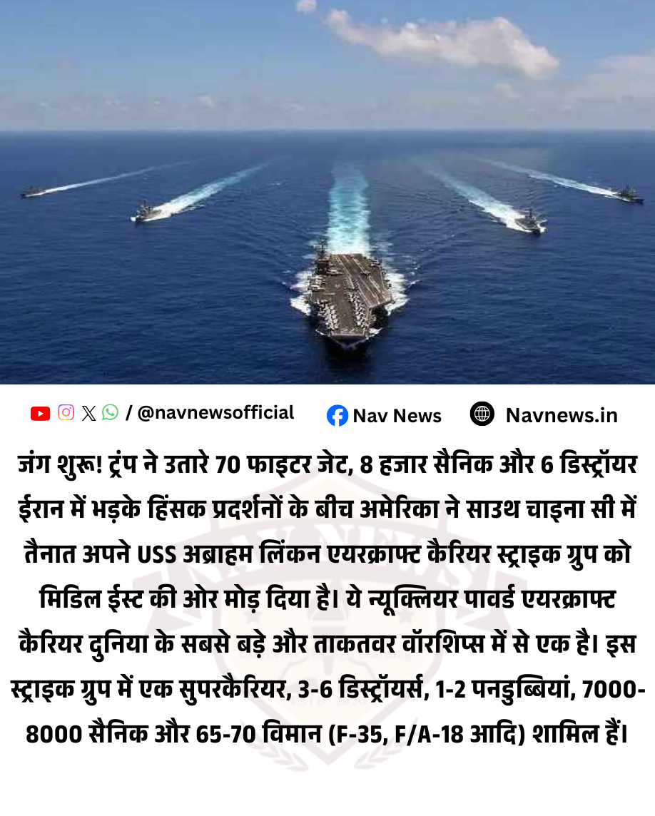 16 जनवरी 2026 की ताजा रिपोर्टों के अनुसार, अमेरिकी रक्षा मंत्रालय (पेंटागन) ने दक्षिण चीन सागर में तैनात USS अब्राहम लिंकन (CVN-72) कैरियर स्ट्राइक ग्रुप को तुरंत मिडिल ईस्ट पहुँचने का आदेश दिया है। यह कदम ईरान में जारी विरोध प्रदर्शनों में 2,600 से अधिक लोगों की मौत और वहां की सरकार द्वारा दी गई 'फांसी की धमकियों' के जवाब में उठाया गया है।