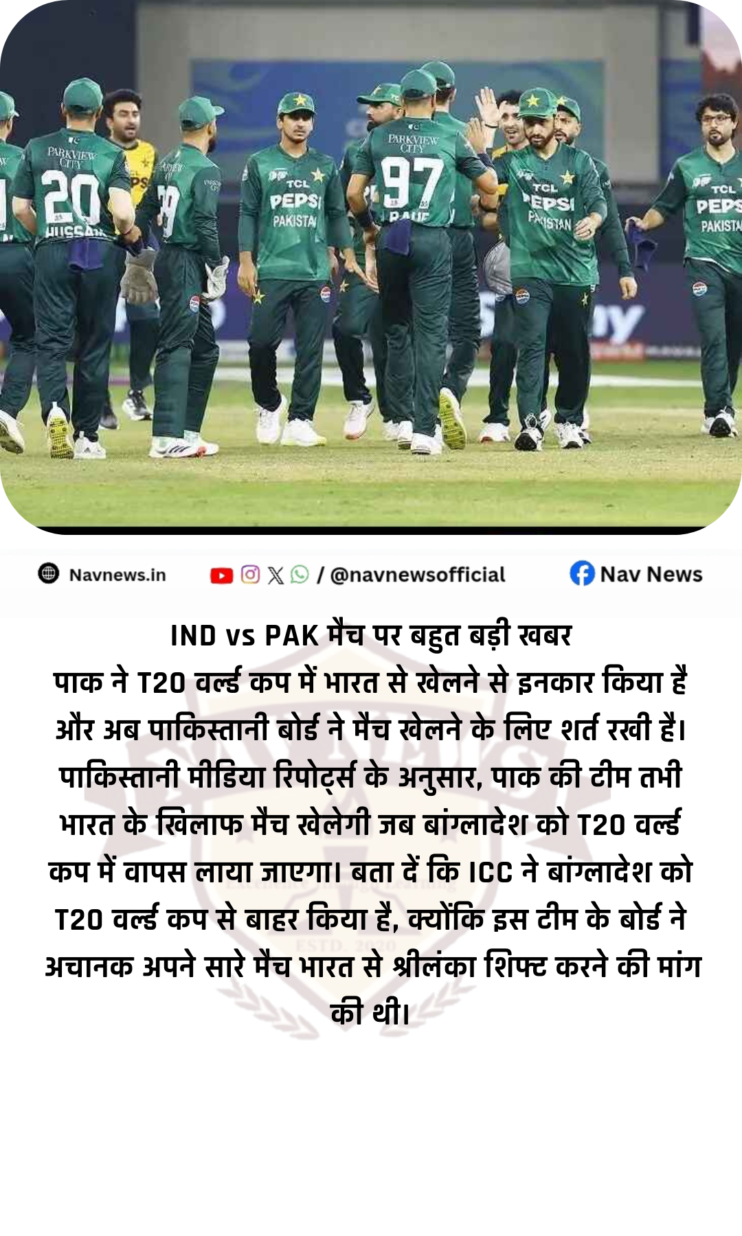 * शर्त क्या है? पाकिस्तानी मीडिया रिपोर्ट्स के अनुसार, पाकिस्तान तभी भारत के खिलाफ अपना मैच खेलेगा जब आईसीसी (ICC) बांग्लादेश को टूर्नामेंट में वापस शामिल करेगा। पाकिस्तान का तर्क है कि बांग्लादेश के साथ "अन्याय" हुआ है और आईसीसी भारत के दबाव में काम कर रही है।
